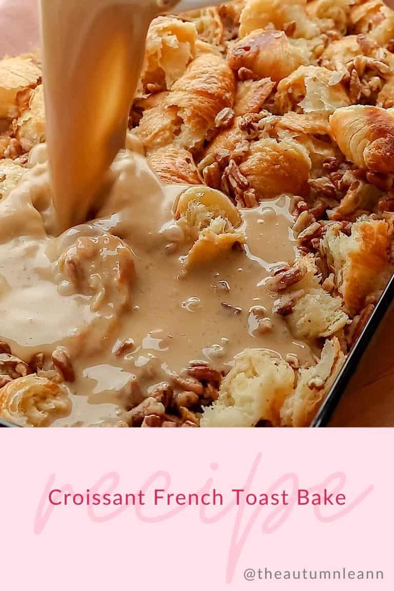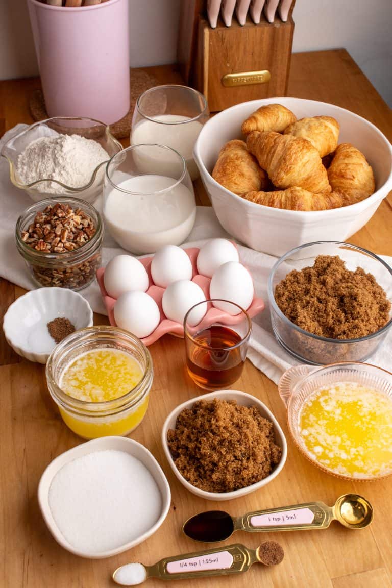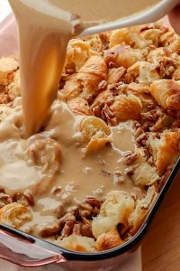 - Layer the croissants into a greased 9x13 baking dish and sprinkle the pecan pieces evenly over the top.