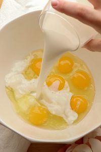 - In a large bowl, whisk together the brown sugar, melted butter, heavy cream, milk, eggs, vanilla paste, maple syrup, nutmeg, and salt until smooth and well combined.