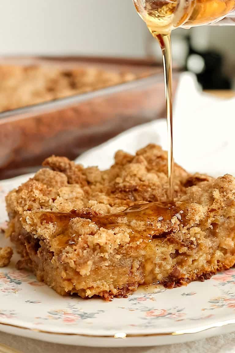 - Sprinkle the streusel evenly over the soaked croissant bake.