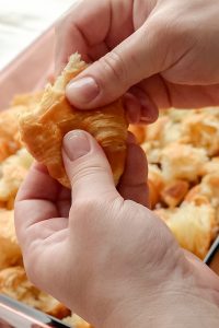 - Layer the croissants into a greased 9x13 baking dish and sprinkle the pecan pieces evenly over the top.