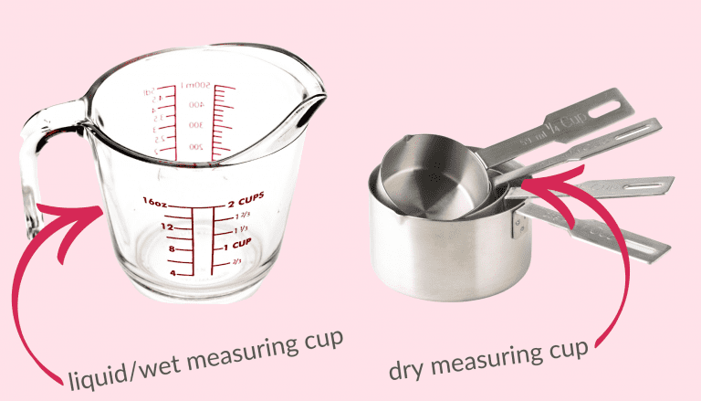 That’s why it’s so important to measure your ingredients correctly. In the image below you can see the differences between a dry measuring cup and a liquid measuring cup. Liquid measuring cups often have lines for fluid ounces, cups, and milliliters, making it easier to measure without having to convert to a different unit of measurement. Using liquid measuring cups for your wet ingredients also lets you measure them more accurately without spilling as easily (since with dry measuring cups you’re supposed to fill to the top).
