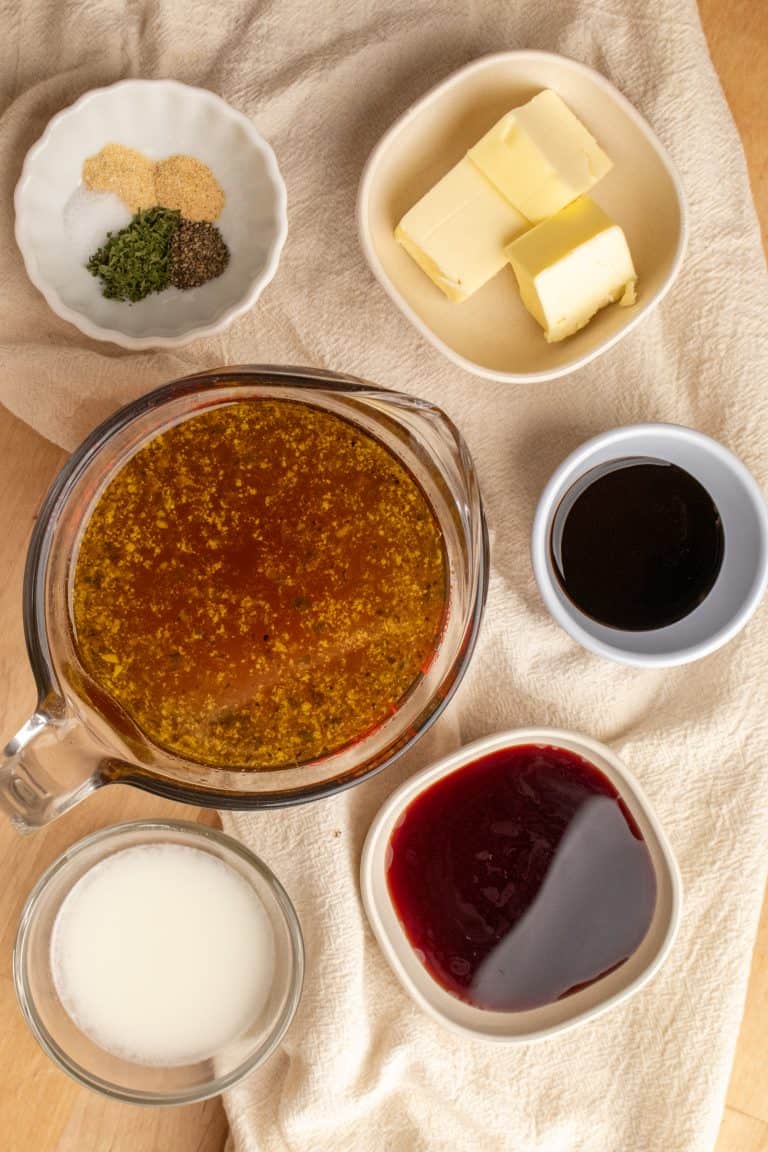 - Add butter, red wine, beef broth (take from slow cooker once meat has finished cooking), worcestershire sauce, and seasonings to a saucepan and heat to a boil.