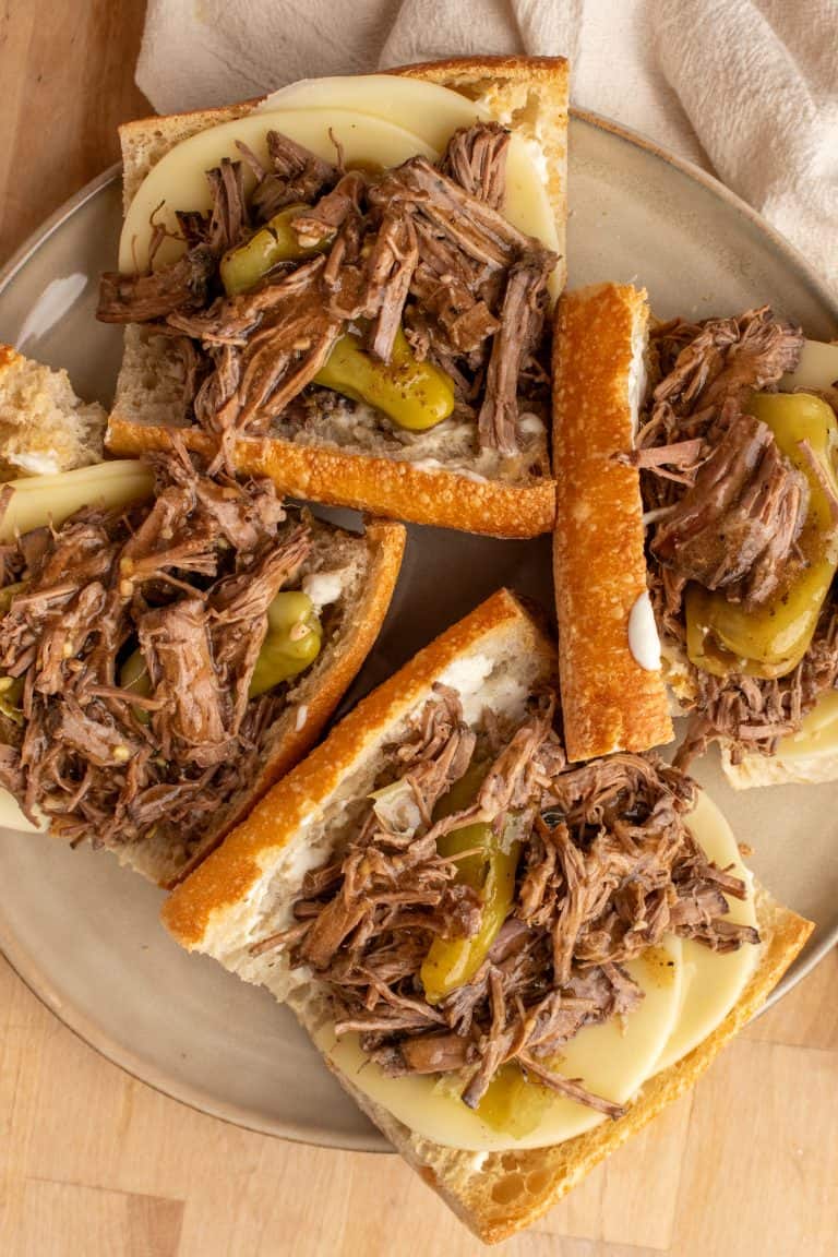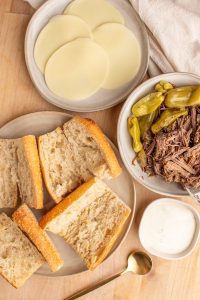 - Slather ranch spread on the inside of the bun, then add the cooked beef and sliced smoked provolone cheese, and additional pepperoncini peppers if desired.