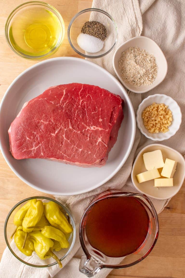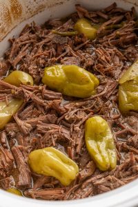 - Add roast, ranch seasoning, beef broth, butter, salt, pepper, garlic, pepperoncini peppers, and pepperoncini juice to slow cooker and mix together. Cook on low for 8-10 hours, or on high for 5-6 hours. When it’s done, you’ll be able to easily shred the roast with a fork.