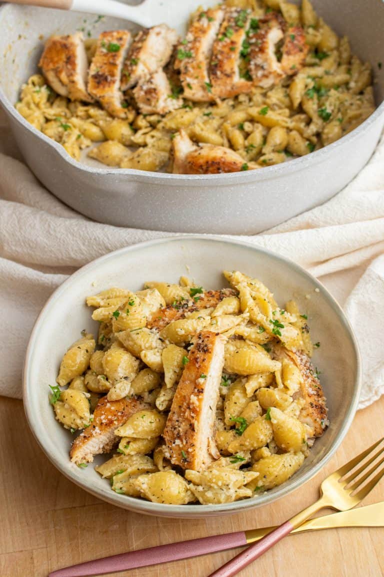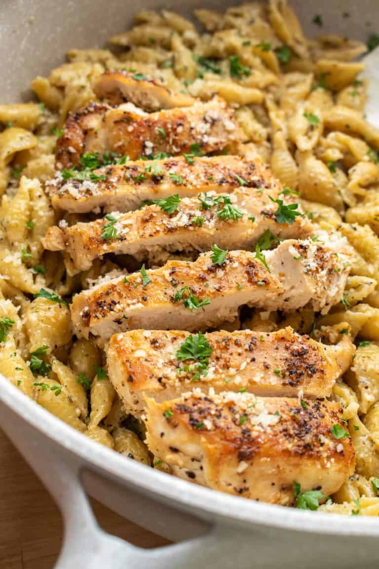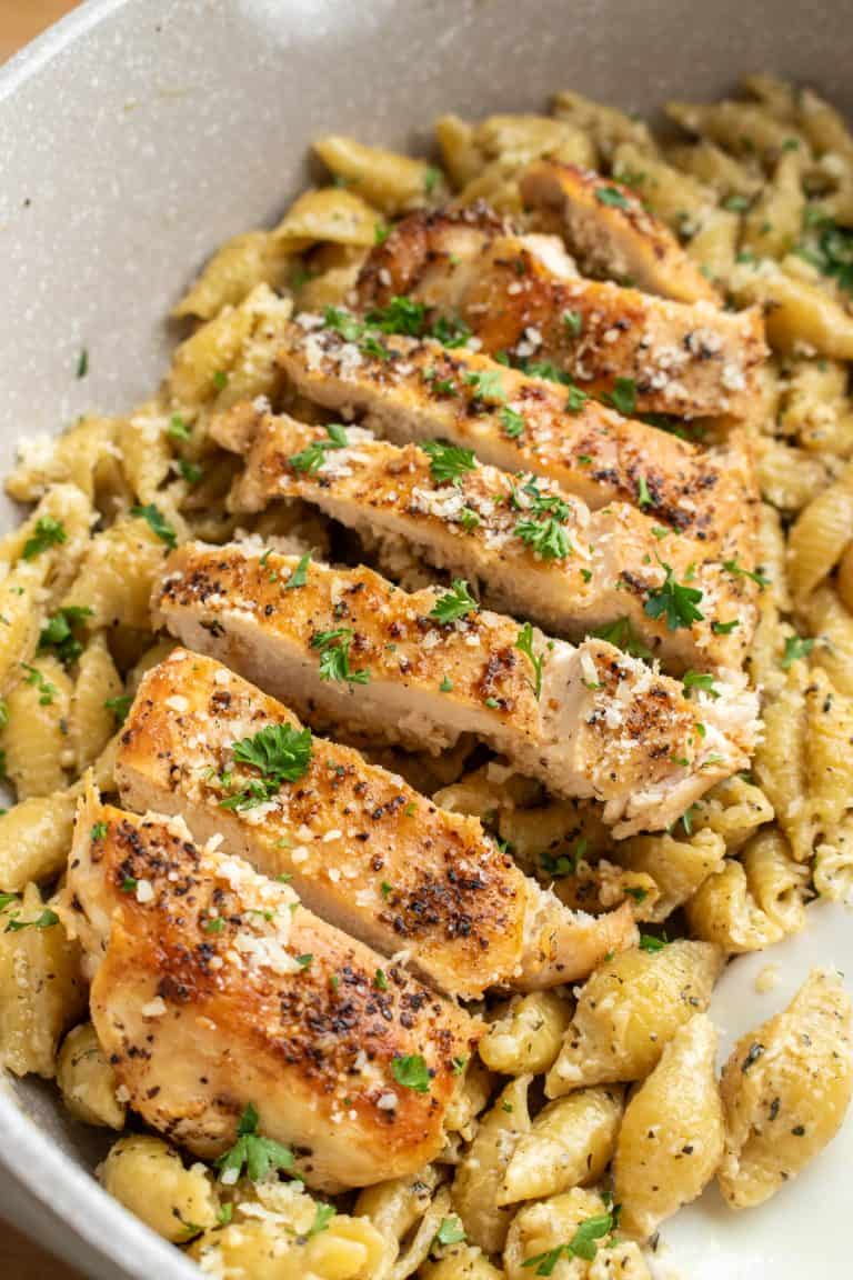 - Slice the chicken and serve on top of the pasta.