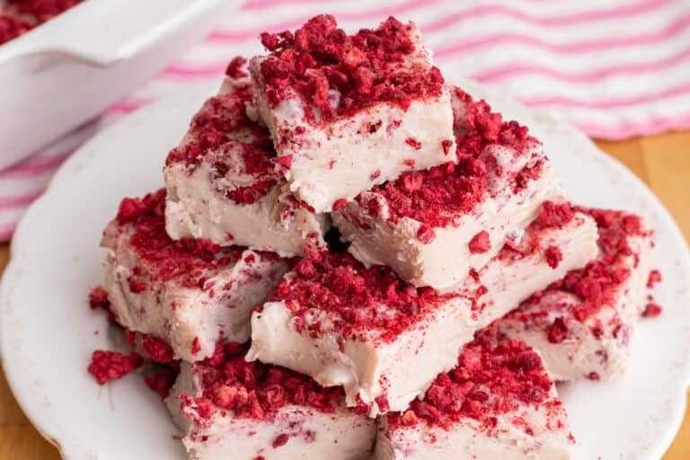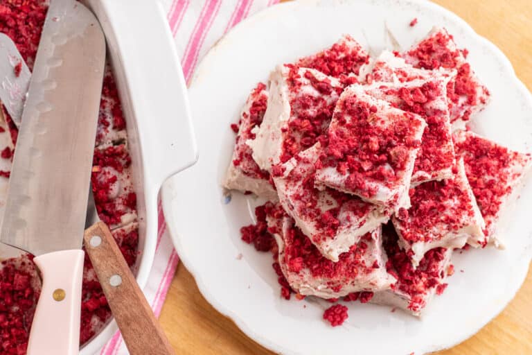 - Sprinkle crushed freeze dried raspberries on top of the fudge as desired, then cover and chill in the refrigerator for 2 hours (or until set).