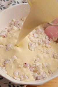 - In a separate container, whisk together eggs, heavy cream, and vanilla.