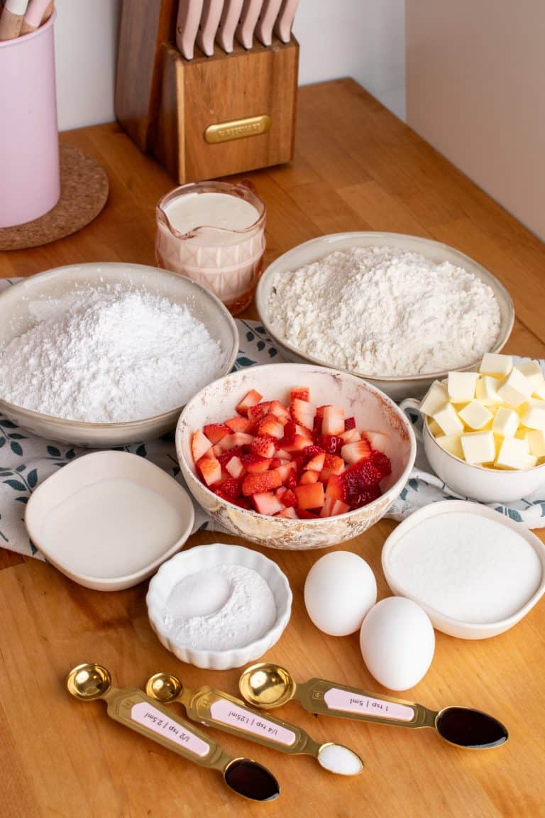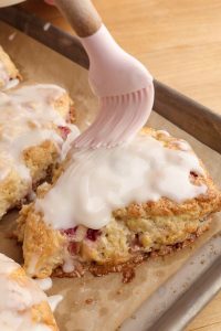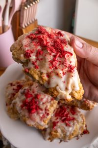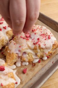 - Glaze scones after cooling for 10 minutes, sprinkle with crushed freeze dried strawberries